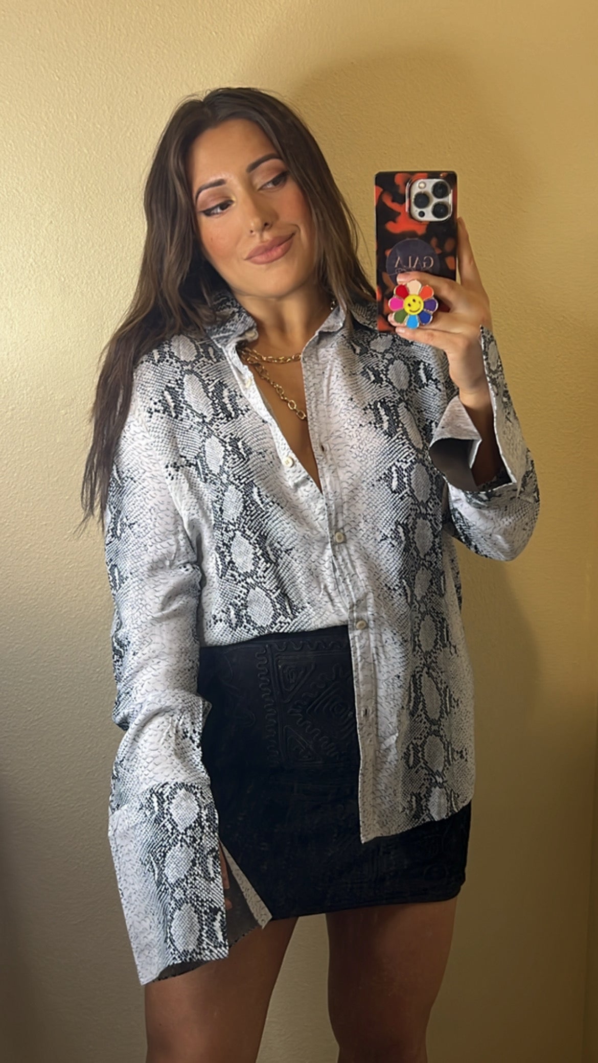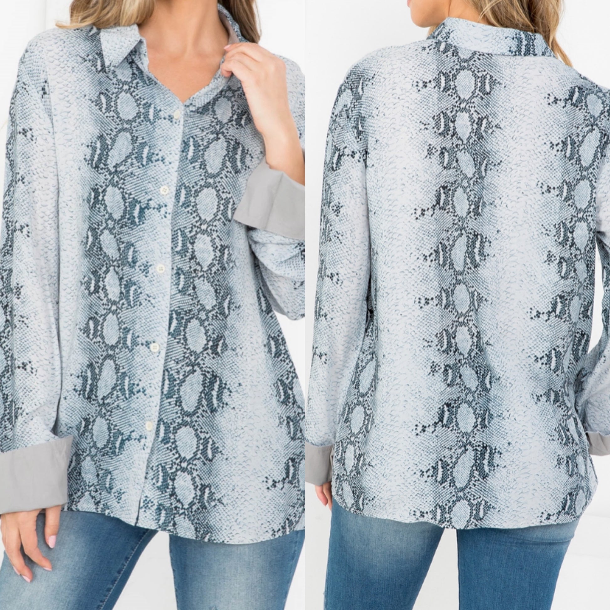 Snake print button down top, comes in a baby blue color & is more of a loose fit.